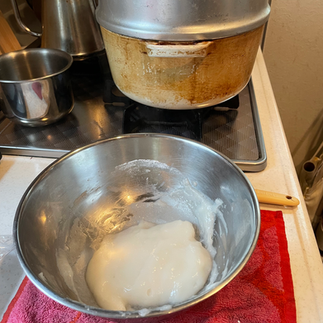 蒸せたら、ボールにうつし、しゃもじですばやくこね、粘りを出して整える。